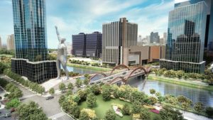 The Victor is a 60-metre (200 ft) tall steel statue designed by Filipino-American artist Jefrë which will be erected at the foot of the Bridgetowne Bridge. The colossal public art piece is expected to be one of the tallest lighting projection art installations in the world.[3] It was inspired by the company’s founder, John Gokongwei, who “despite the challenging early part of his life, emerged victorious by building a successful and huge conglomerate” in the Philippines.[4] The marine-grade perforated steel art piece is also said to symbolize unity, hope, strength and success of ordinary Filipinos. It is slated for completion by Q1 2021.[3][4]